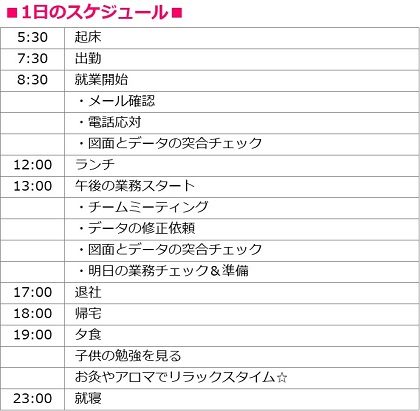 基本的に残業が発生しない部門で就業をしているため、毎日のサイクルが崩れません。