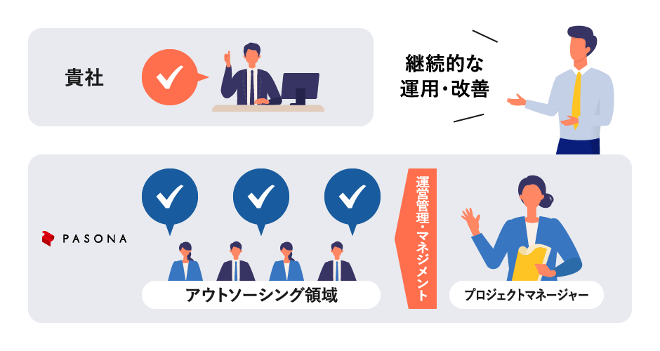 パソナのBPO事業運営における人事・教育制度等、専任プロジェクトマネージャーが事業運営に必要なスキルアップ研修や、コミュニケーションが円滑にできる仕組みを整備。業務が属人化せず、サービスの品質を落とさない運営を可能にしています。