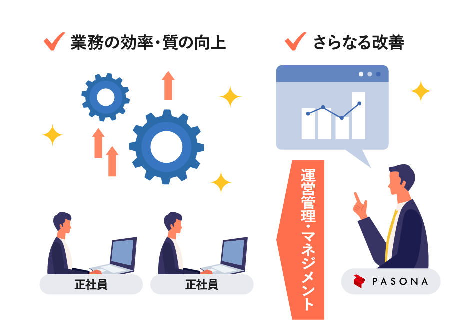 業務の改善や新たな仕組みづくりを目指すにあたっては、社内のノウハウでは不十分な場合があります。パソナに存在するさまざまなナレッジを取り入れ、トータルで効率的な業務改善を行いつつビジネスをより強化していくことが可能です。