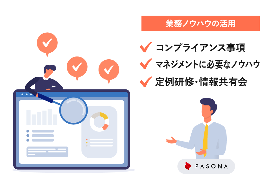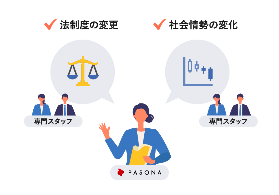 法改正によって、運営方法が大きく変化する場合が多々ありますが、社内ノウハウが乏しい場合は人員配置や業務管理など既存体制で行う事は大きな負担です。パソナでは各業務に関する専門的なノウハウを使い、課題解決に対応しております。